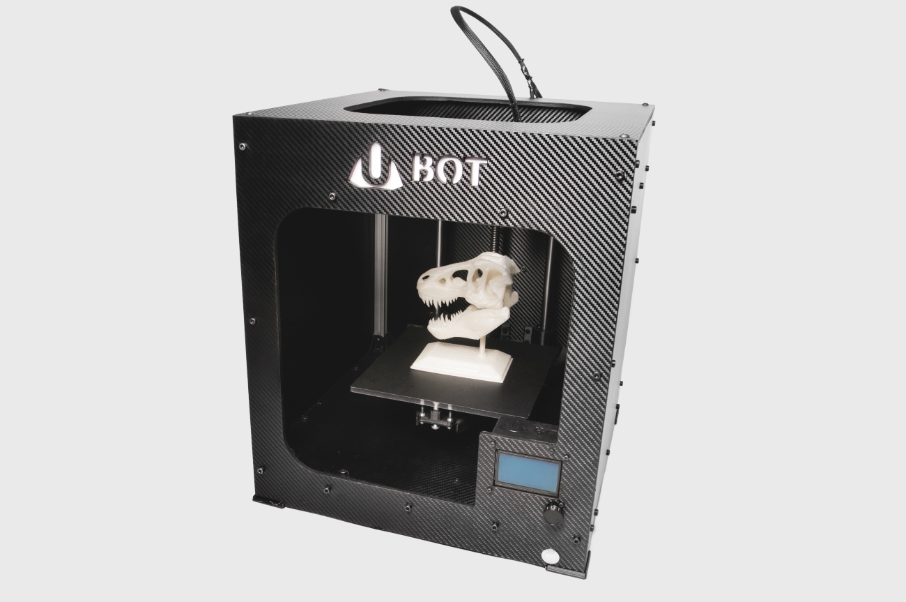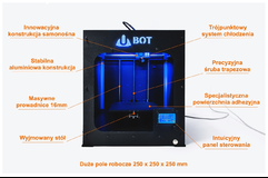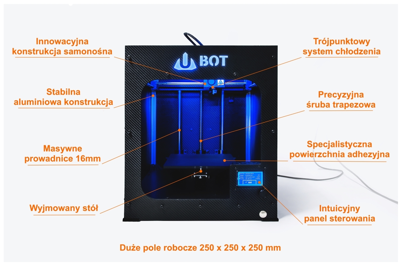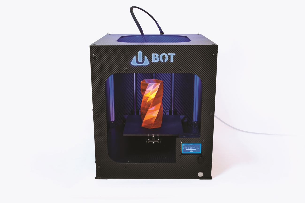 Model drukarki UBOT 3D, którego cena zaczyna się od 3999zł netto, cechują: wysoka jakość wydruku przy dużych prędkościach, zdejmowany stół, specjalistyczna powierzchnia adhezyjna, duże (250x250x250mm) podświetlane pole robocze, możliwość drukowania z każdego rodzaju termoplastów, które obecnie znajdują się na rynku (PLA, ABS, HIPS, PET, NYLON oraz wiele innych). Sztywna i stabilna konstrukcja, w miłej dla oka karbonowej obudowie, będzie elegancko wypełniać przestrzeń w każdym domu i biurze.