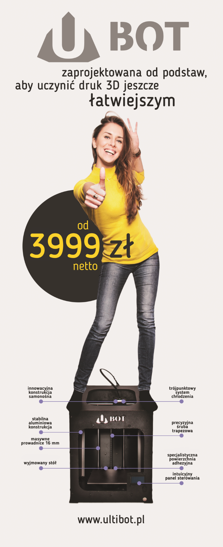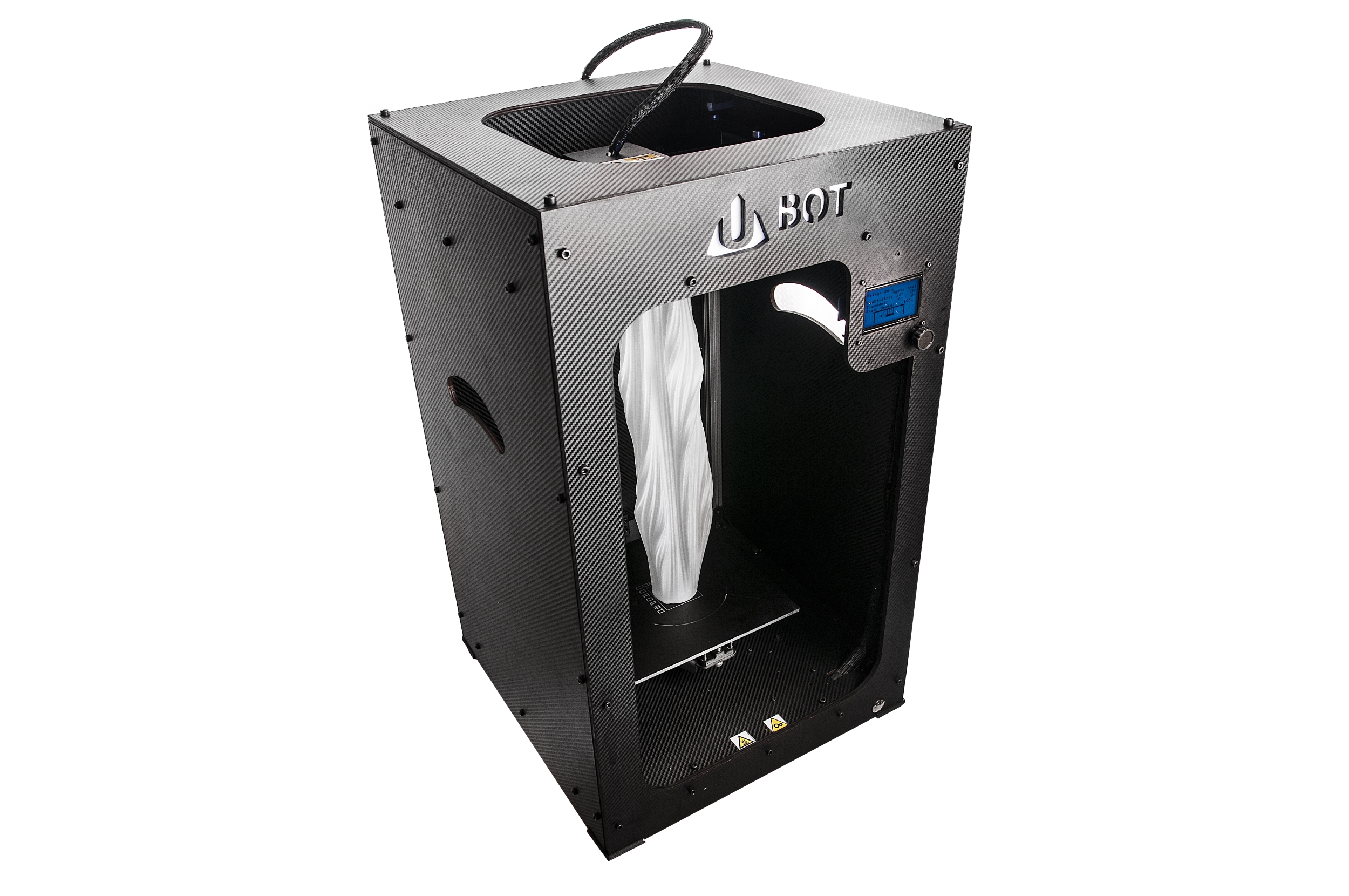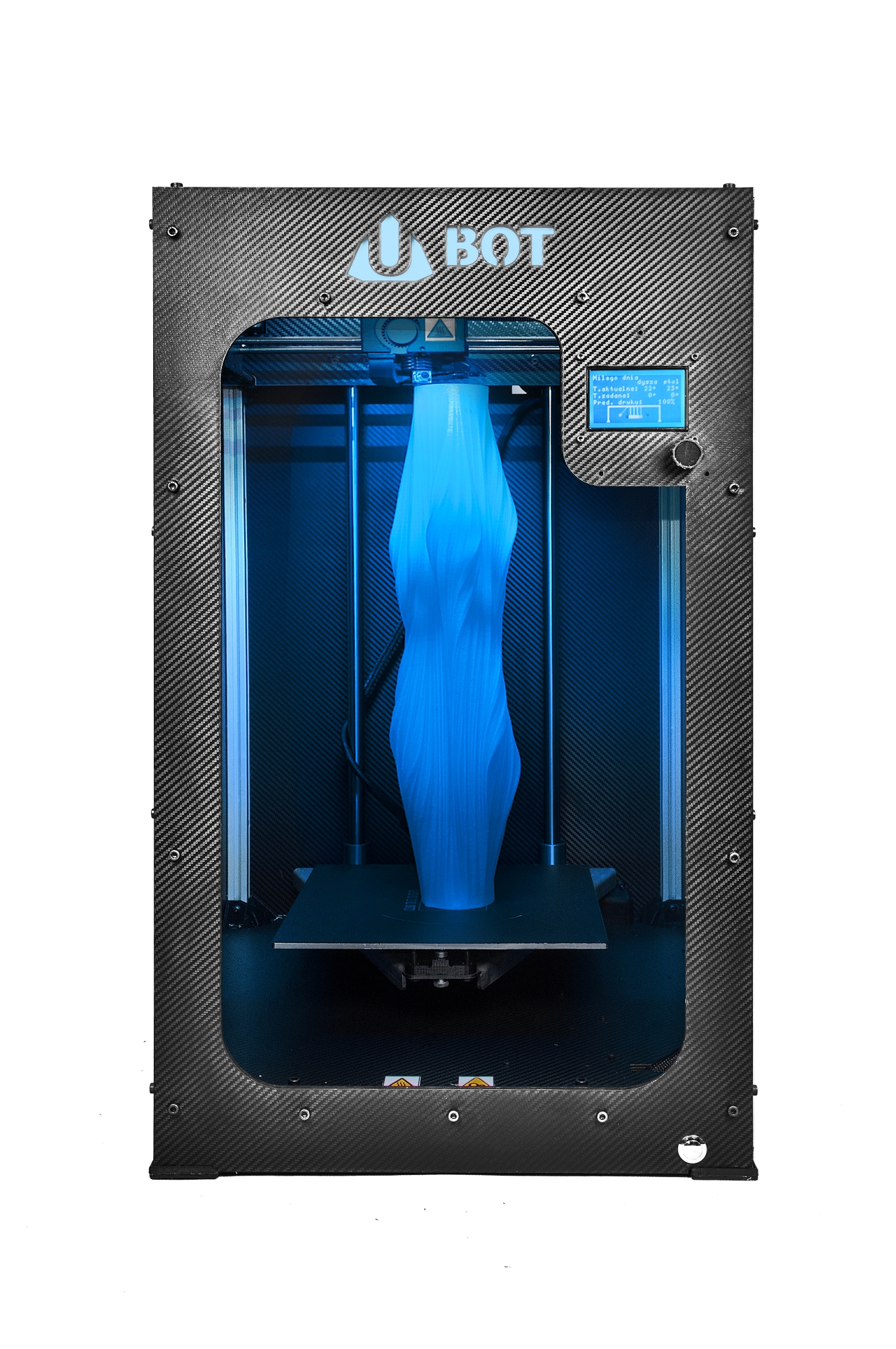 Model drukarki UBOT 3D, którego cena zaczyna się od 3999zł netto, cechują: wysoka jakość wydruku przy dużych prędkościach, zdejmowany stół, specjalistyczna powierzchnia adhezyjna, duże (250x250x250mm) podświetlane pole robocze, możliwość drukowania z każdego rodzaju termoplastów, które obecnie znajdują się na rynku (PLA, ABS, HIPS, PET, NYLON oraz wiele innych). Sztywna i stabilna konstrukcja, w miłej dla oka karbonowej obudowie, będzie elegancko wypełniać przestrzeń w każdym domu i biurze.